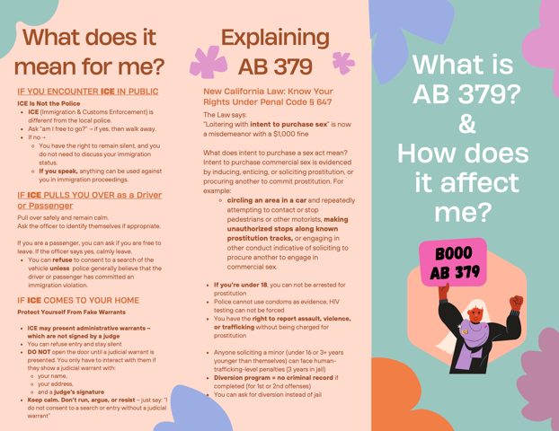 Know your rights! Use and share these pamphlets to spread the word about how AB 379 can impact you, and how to deal with agencies like ICE and law enforcement.
