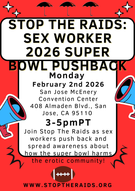 Join Stop The Raids as sex workers push back and spread awareness about how the Super Bowl harms the erotic community! For more information email stoptheraidsusa@gmail.com. Use the below images to spread awareness about this upcoming symposium!